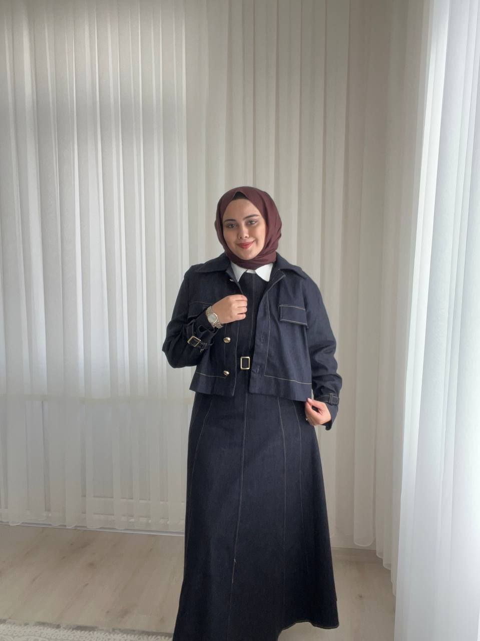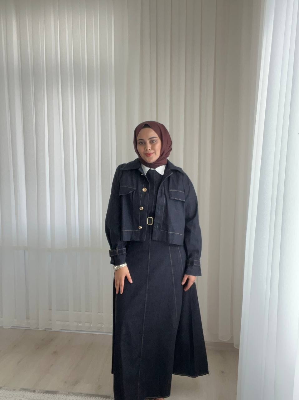 Ürün Açıklaması: Modern ve feminen tasarımıyla öne çıkan bu denim jile elbise, vücut proporsiyonunu dengeleyen formu sayesinde daha ince bir siluet görünümü sunar. Kulplu yapıya sahip jile elbise, gold düğme detaylı kısa ceket ile tamamlanarak şık ve güçlü bir stil oluşturur. Gold tokalı kaplama kemer bel hattını vurgularken, zıt dikiş detayları tasarıma hareket ve karakter kazandırır. %80 pamuk içeriğe sahip denim kumaşı gün boyu konfor sağlar. Hem tek başına hem takım olarak farklı kombin seçenekleri sunar