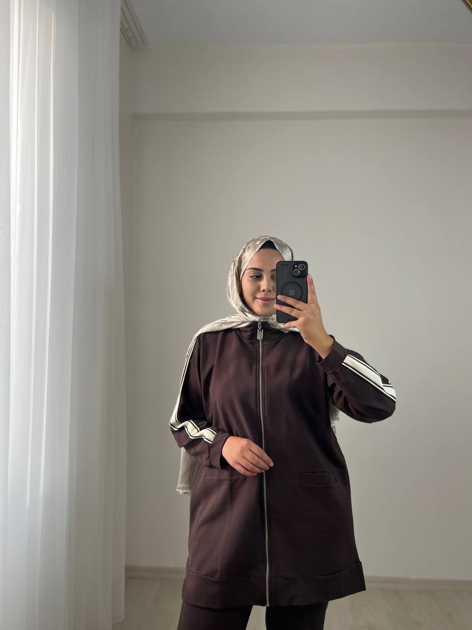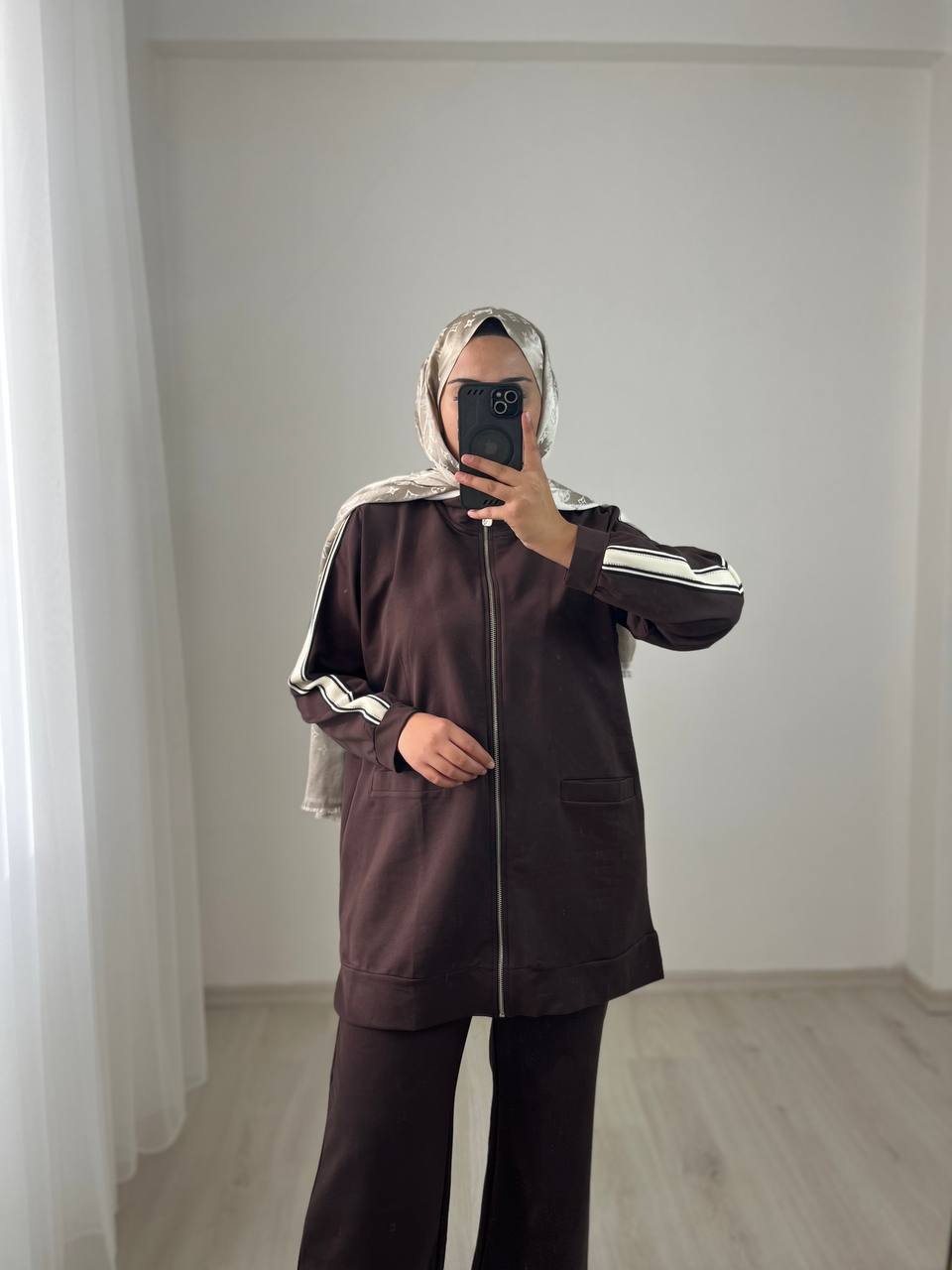 Kolları Şerit Taşlı Takım - KAHVERENGİ
