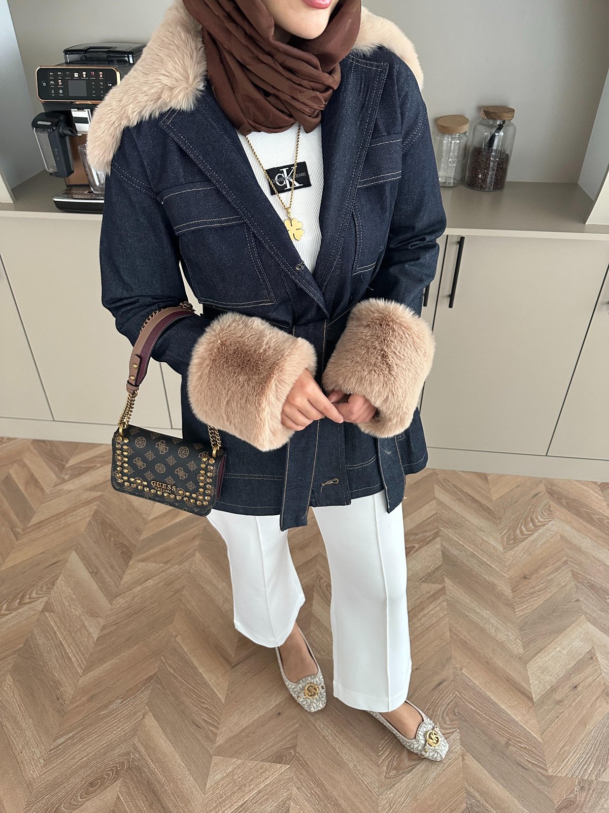 Kot kumaştır - kollar ve yaka peluş detaylıdır çıkarılabilir - ceplidir - seyyar kuşaklıdır - önden düğmelidir